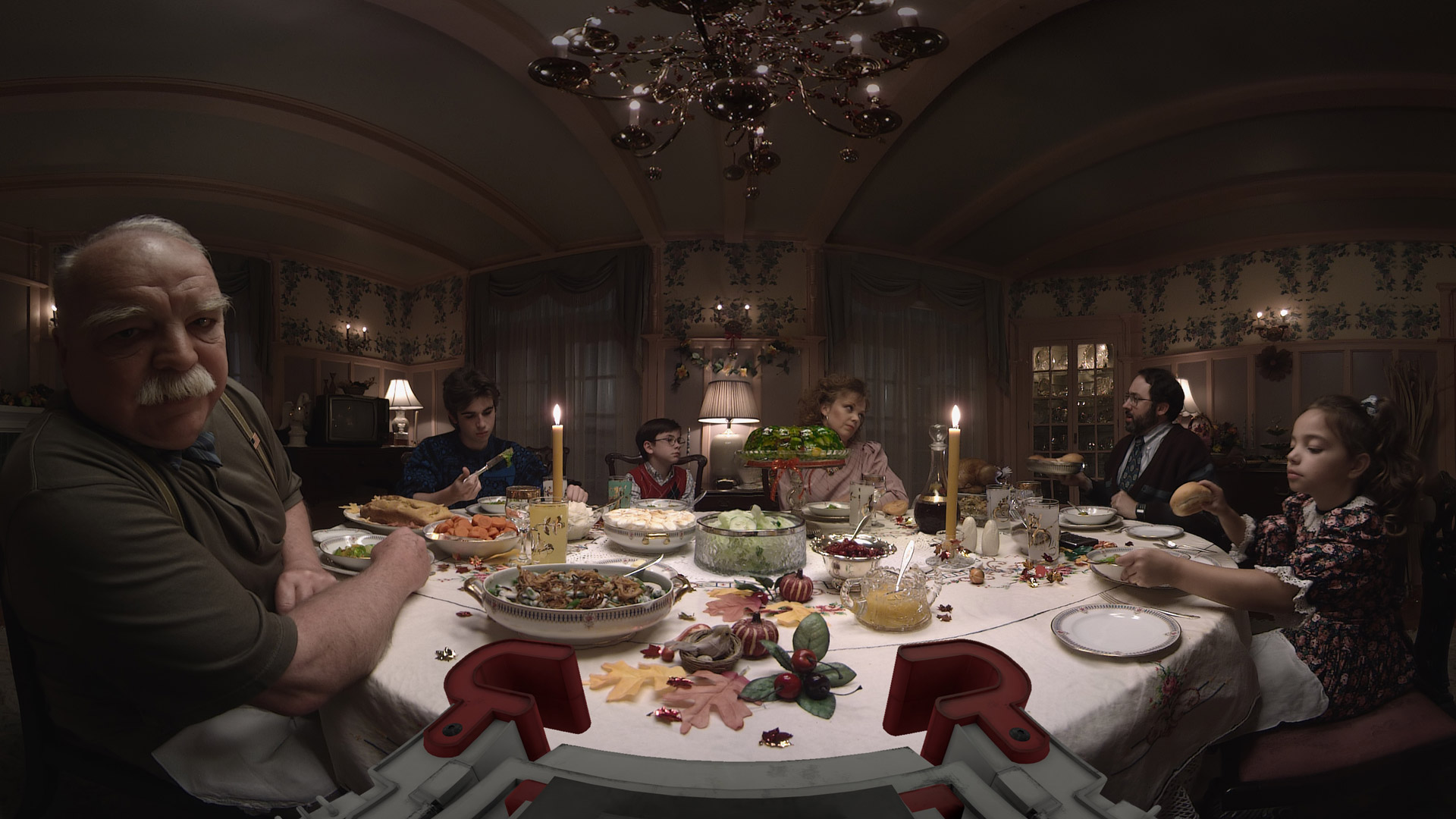 Turning your gaze back toward the family from your low vantage point on the floor, you spot the young boy who is excitedly cheering at you, his new toy. Around the scene you’ll also find a young girl, a young teenage boy, a mother and father, and the family’s grandfather in a wheelchair.