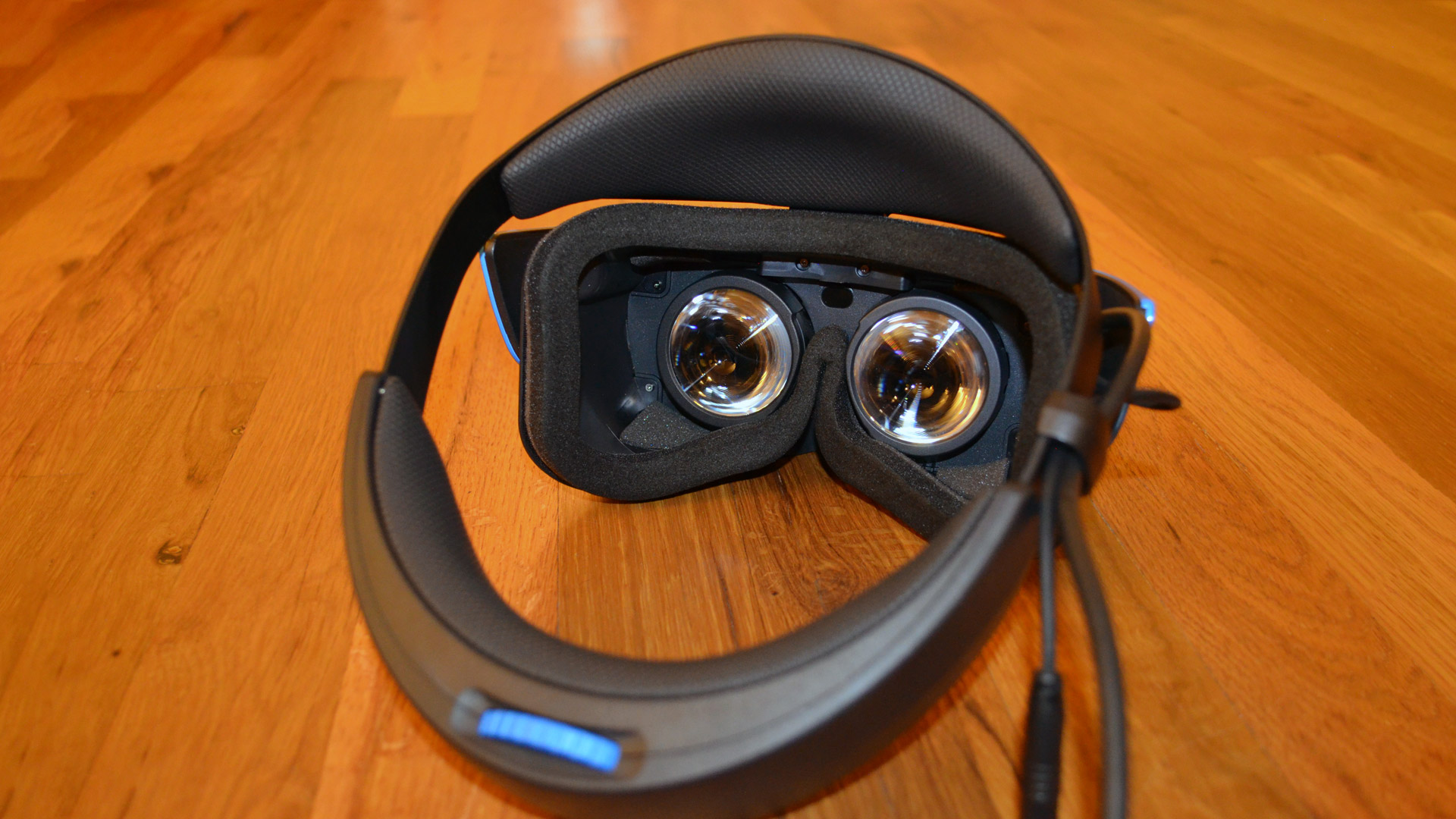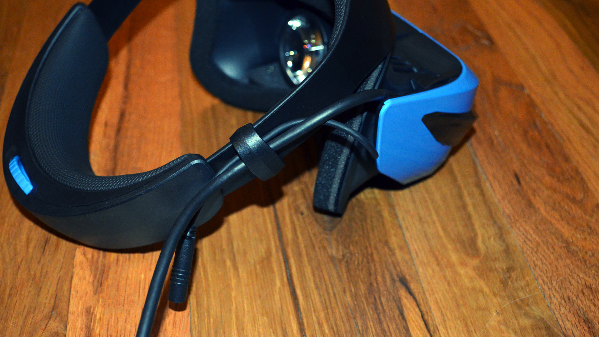 Unfortunately the particulars of the design mean it can be difficult (borderline frustrating) to keep your eyes in the small sweet spot of the lenses. It feels as if the headset’s fit was designed without consideration of the weight of the cord; its weight essentially means the headset is always off-balance to the right side, necessitating counter-tilting and tightening the headstrap more than you should need to. It seems they should have had the cord come out the center of the back strap.