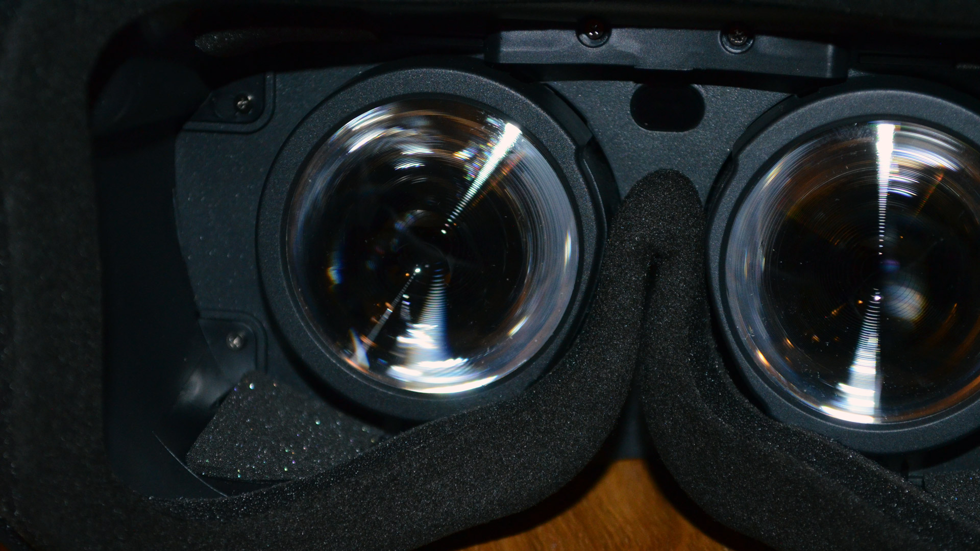 When it comes the lenses, we’re looking at Fresnel with medium grit ridges (between the Rift {fine} and the Vive {coarse}); expect to see god ray artifacts in high contrast scenes. The headset makes it easy to get your eyes very close to the lenses (but not so easy to keep them there, more on that below) which results in a field of view which falls well into the same class as the Rift & Vive.