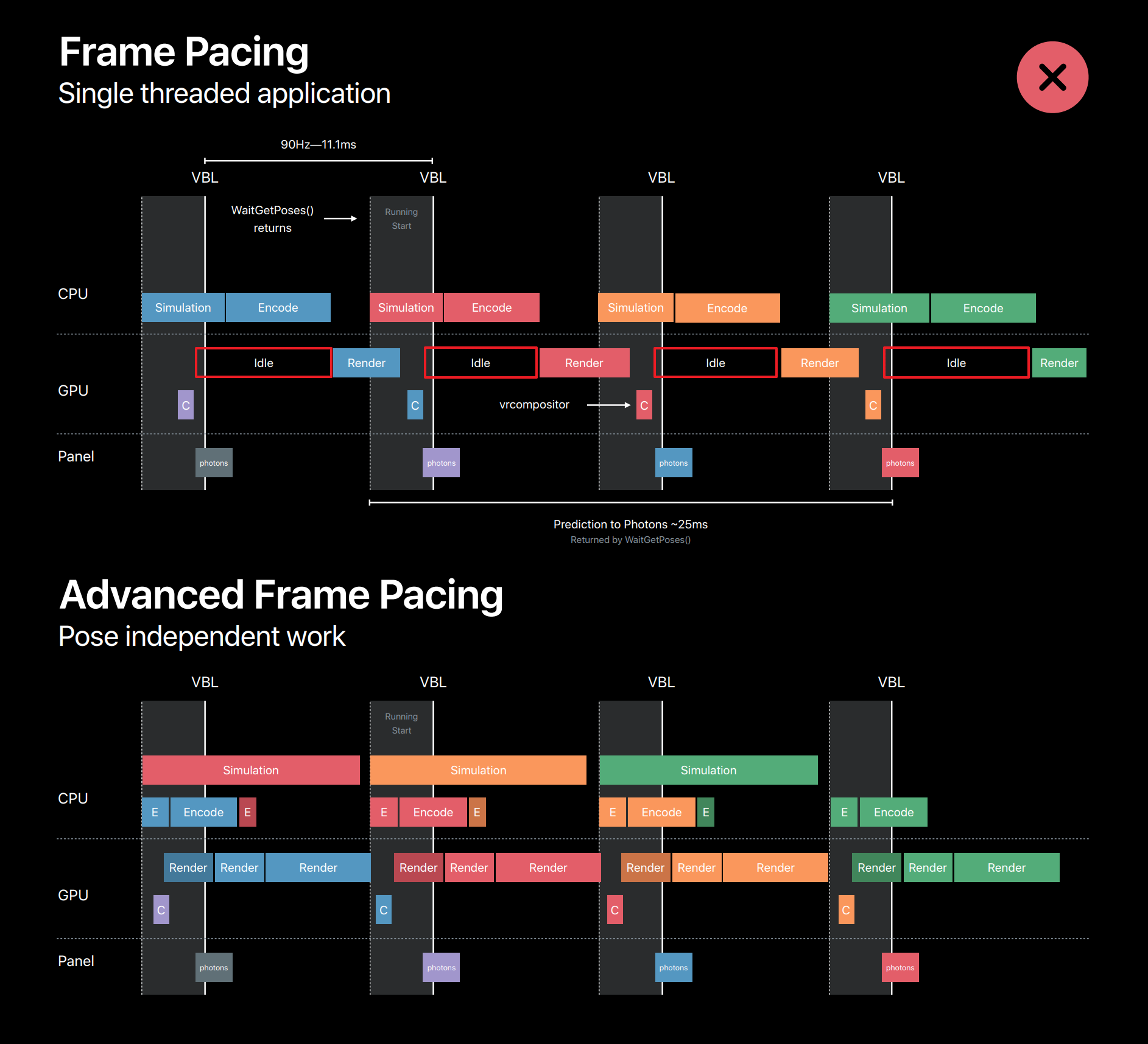 In short, Gasiński talked about advanced frame pacing techniques, saying that developers should use multi-threading, split command buffers, separate pose-dependent and pose-independent workloads, separate workloads by frequency of update (to benefit from multi-GPU configurations), and ensure that each GPU has a separate rendering thread to ensure asynchronous rendering.