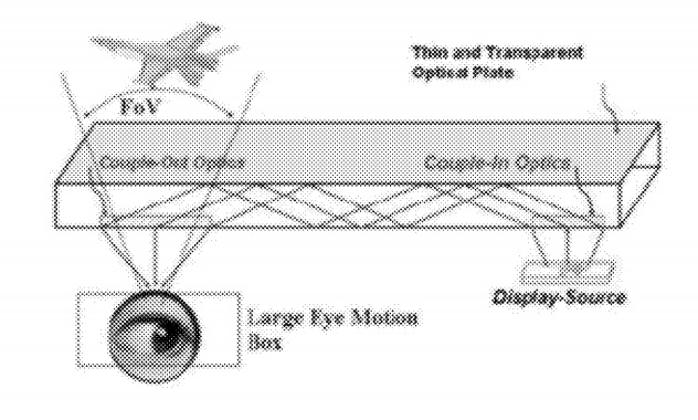 Originally filed back in June 2012, months before the Oculus was to make waves with its Rift DK1 Kickstarter campaign, this “continuation”, published by the US Patent and Trademark Office, extends an even older application, originally filed back in 2006. The patent is described as a “Peripheral Treatment of Head-mounted Displays” and details a form of AR display that seems to utilise technology similar to optical waveguide, a way to bounce light from a source to a destination with minimal loss of signal. In this case, the image is projected from a source off axis, reaching the eye via a transparent material (such as a visor or plate mounted over the eyes). Microsoft’s HoloLens uses a technique to display a virtual overlay onto the user’s view of the real world to create it’s so called “holograms”. Apple’s diagram, attached to the patent update, includes a label “Large Eye Motion Box”, perhaps indicating the display will feature a relatively high field of view for such a device.