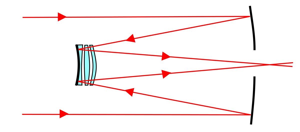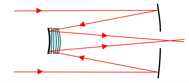 Catadioptric optics, commonly used in high magnification optical systems like telescopes and microscopes, ‘fold’ the optical path to create a more compact arrangement. Rather than light being simply bent as it passes once through a typical lens, in a catadioptric optic the light bounces back and forth a number of times along its optical path before eventually emerging from the other side.