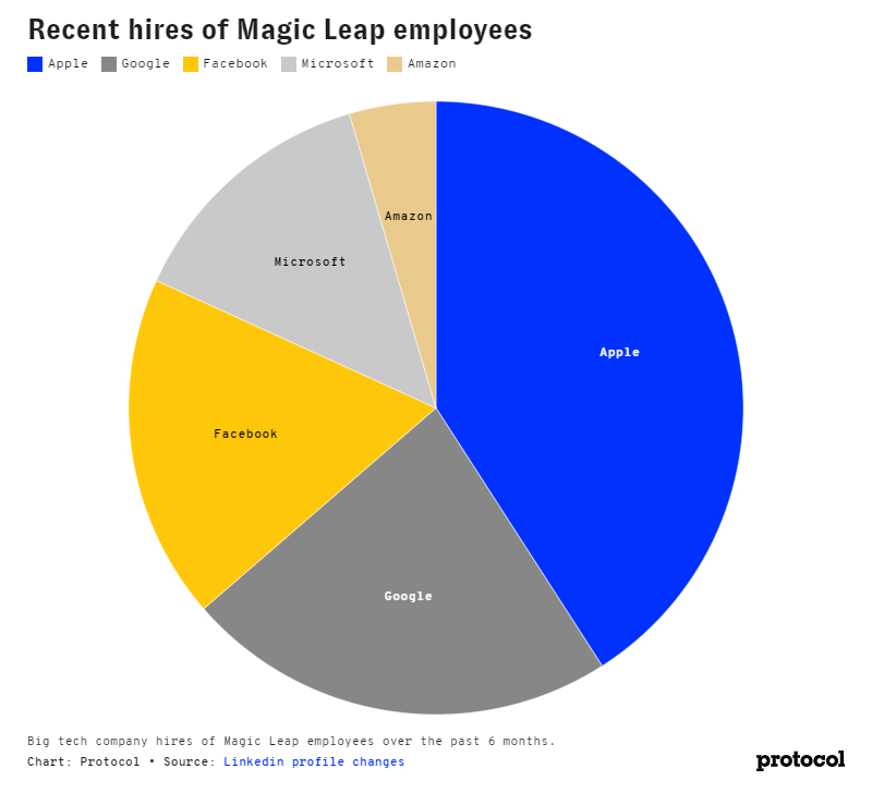 According to an investigation of LinkedIn profiles by Protocol, many former Magic Leap employees have taken up residence at Silicon Valley’s most prominent tech companies, including Apple, Google, Facebook, Microsoft and Amazon.
