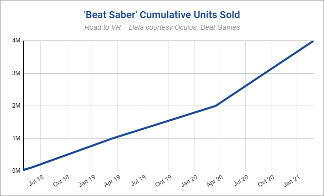 Beat Saber has officially reached 4 million units sold, Oculus today announced, along with 40 million songs of paid DLC, pushing the app’s estimated revenue to $180 million.