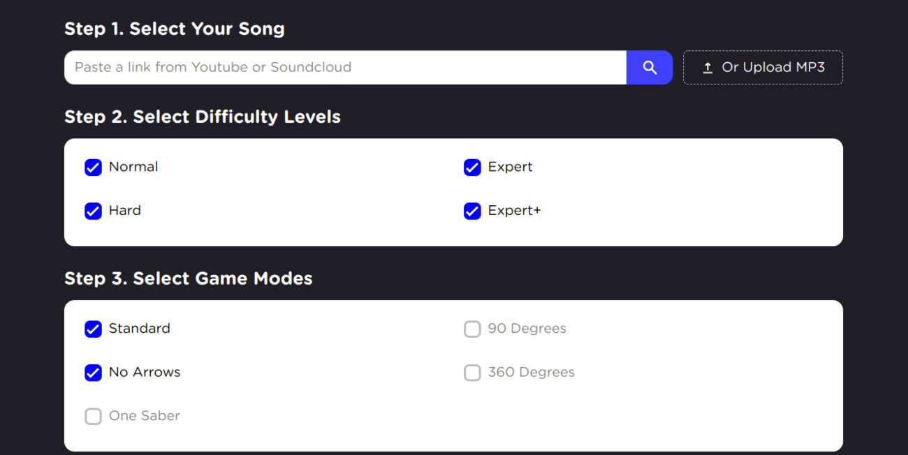 Beat Sage is an AI which creates custom beat maps with any song on YouTube, or any mp3 in your possession. Simply navigate to the Beat Sage website, plug in the song’s YouTube URL (or upload your own mp3), tick a few boxes for level difficulty, game modes, and song events, and you’ll have a brand new mess of levels for Beat Saber on SteamVR headsets and Oculus Quest. And it’s free.