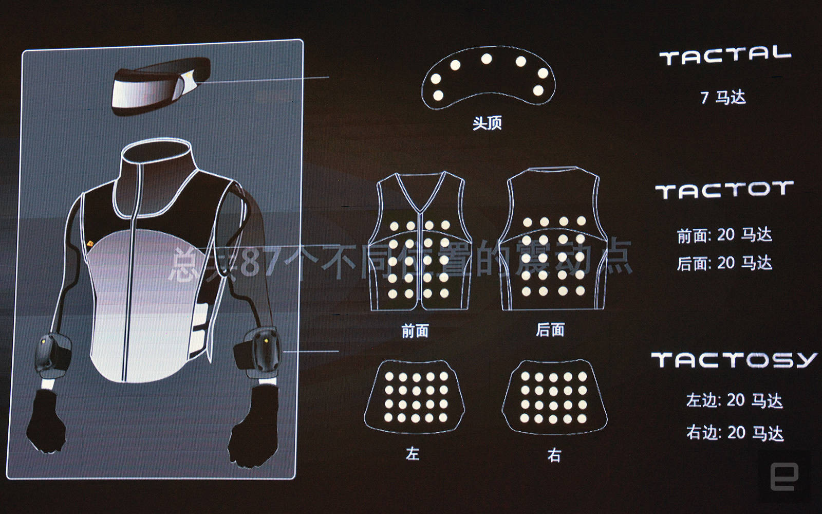 Everything in the TactSuit kit is wireless (Bluetooth Low Energy), which includes a vest and two ‘Tactosy’ arm bangles. There’s also a head-mounted haptic piece that wasn’t present at the show, which bHaptics explained to me was because it’s still in prototyping, and that unlike the picture shown below, which is more of a headband, it would either replace or fit over the foam gasket in either HTC Vive or Oculus Rift.