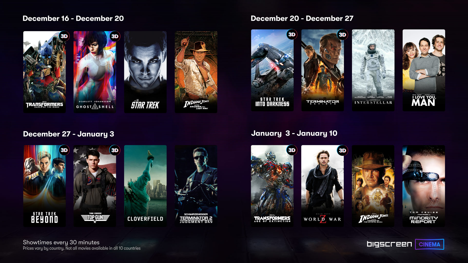 This week’s films include 3D versions of Transformers: Dark Side of the Moon (2017) and Ghost in the Shell (2017), and 2D versions of Star Trek (2009) and Indiana Jones and the Raiders of the Lost Ark (1981).