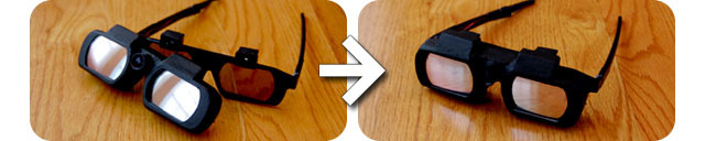 Your position relative to the surface and the projected image is provided by a tracking marker, placed somewhere in the play area. IR LEDs on the marker are picked up by a camera on the bridge of the player’s glasses and used to extrapolate translation information. This means, you can move freely around the play space and the game view will shift as expected.
