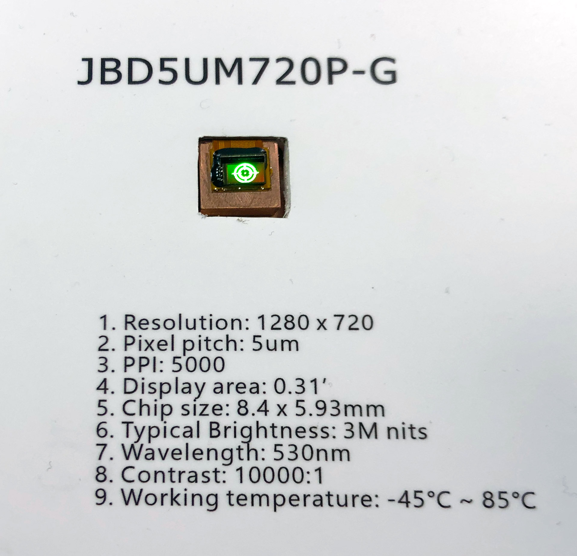Founded in 2015, JBD has been working to commercialize micro LED display technology. The company says its focus is on creating the “smallest, brightest, and most efficient micro-display panels,” and is “currently transitioning from a research-and-development phase into a manufacturing-and-sales phase.”