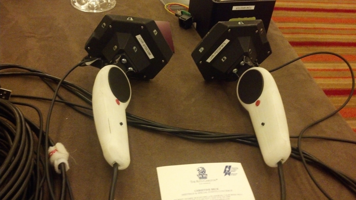 The controllers (above) were different than those seen at GDC; they were white, with cables coming out of both the Lighthouse crown on top and from the bottom of the controller. These developer prototypes were older versions, but the Lighthouse tracking tech is identical in concept to what will ship with the platform at retail. As seen in the photo above, there are sensors embedded into the crown on the top of the controllers, the same type seen on the HTC Vive headset. According to a Tweet by Chief Pharologist Alan Yates of Valve, those sensors are photodiodes. Below the sensors are circular track pads that can be pushed down like gamepad buttons, with haptic tech shared by Valve’s Steam Controller: