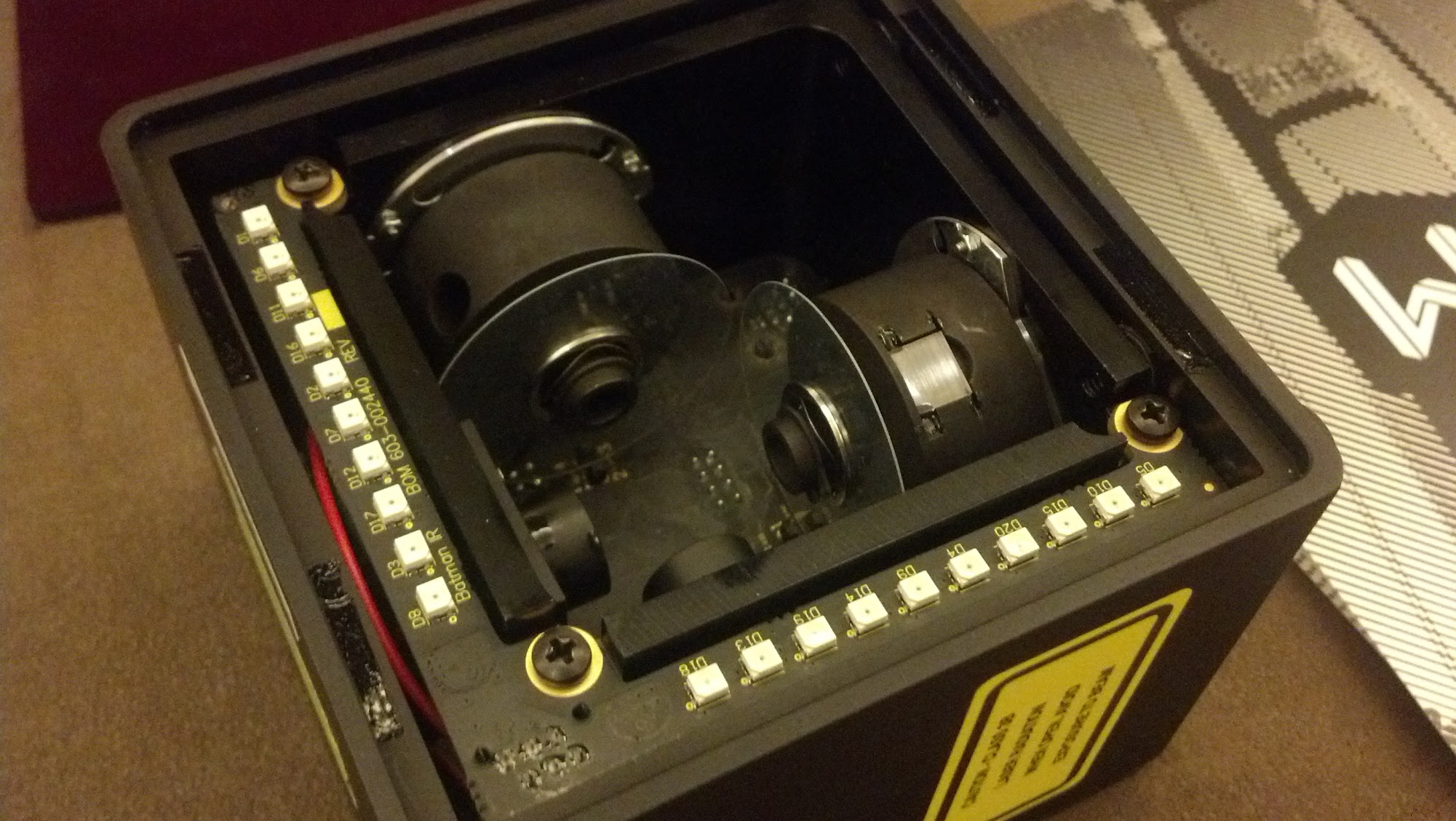 Next to the controllers was a single, semi-naked prototype base station. There are square-mounted LEDs on two of the inside edges. A pair of circular chambers lay inside, where lasers shoot out while the cylinders rotate at a high speed. The lasers are initiated by what is called a laser diode, according to Yates in a conversation on Twitter. As the cylinders spin, they sweep an invisible laser across the room which is detected by the sensors found on Lighthouse compatible devices, be that headsets or peripherals like the controllers.