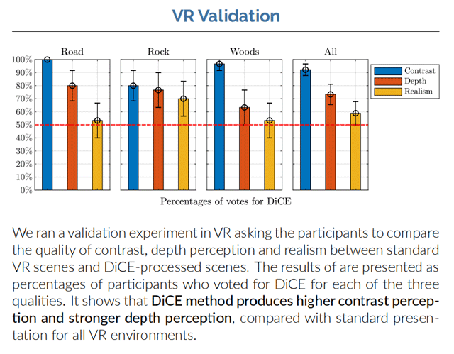 After finding an approach which minimizes binocular rivalry, the researchers tested their findings, claiming “our results clearly show that our solution is more successful at enhancing contrast and at the same time much more efficient [than prior methods]. We also performed an evaluation in a VR setup where users indicate that our approach clearly improves contrast and depth compared to the baseline.”
