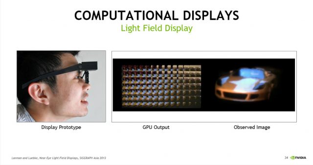 We created a prototype computational light field display allows you to focus at any depth by presenting light from multiple angles. This display represents an important break with the past because computation is occurring directly in the display. We’re not sending mere images: we’re sending complex data that the display converts into the right form for your eye. Those tiny grids of images that look a bit like a bug’s view of the world have to be specially rendered for the display, which incorporates custom optics—a microlens array—to present them in the right way so that they look like the natural world.