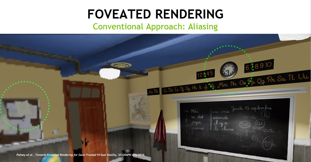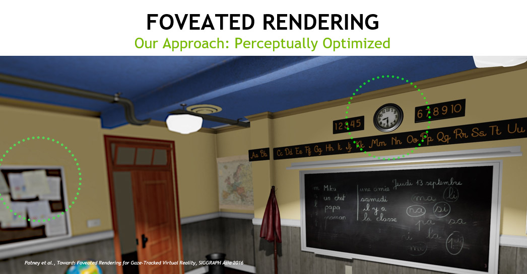 Our first approach to performance is the foveated rendering technique—which reduces the quality of images in a user’s peripheral vision—takes advantage of an aspect of human perception to generate an increase in performance without a perceptible loss in quality.