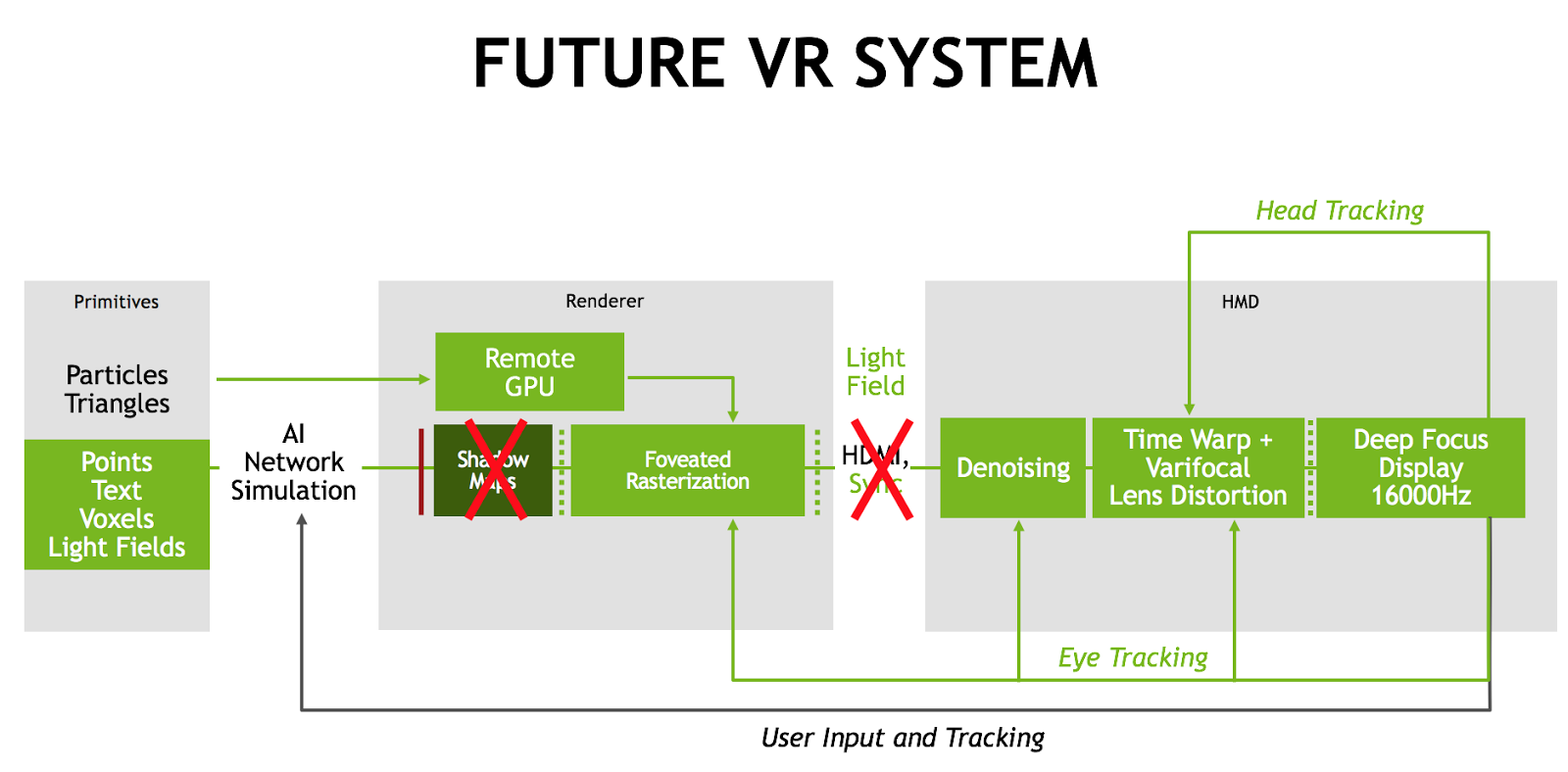 Recall that modern VR is around 450 Mpix/sec today. This means we need a 200x increase in performance for future VR. But with factors like high dynamic range, variable focus, and current film standards for visual quality and lighting in play, the more realistic need is a 10,000x improvement… and we want this with only 1ms of latency.
