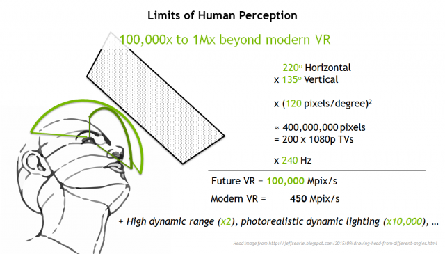 We derive our future VR specifications from the limits of human perception. There are different ways to measure these, but to make the perfect display you’d need roughly the equivalent to 200 HDTVs updating at 240 Hz. This equates to about 100,000 megapixels per second of graphics throughput.