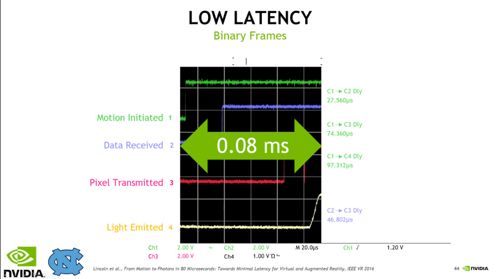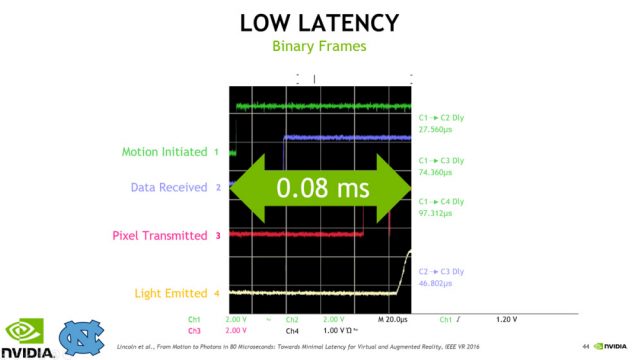 In the graph, time is on the horizontal axis. When the top green line jumps, that is the time at which the person wearing the display turned their head. The yellow line is when the display updated. It jumps up to show the new image only 0.08ms later…that’s about 500 times better than the 20ms you experience in the worst case on a commercial VR system today.