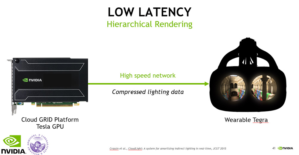 This allows a powerful GPU to compute the lighting information, which it then sends to the Tegra on your body to render final images. You get the benefit of reduced latency and power requirements while actually increasing image quality.