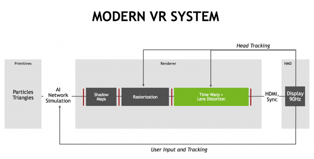 The answer is: ray tracing can do a lot for VR. When you’re tracing rays, you don’t need shadow maps at all, thereby eliminating a latency barrier Ray tracing can also natively render red, green, and blue separately, and directly render barrel-distorted images for the lens. So, it avoids the need for the lens warp processing and the subsequent latency.