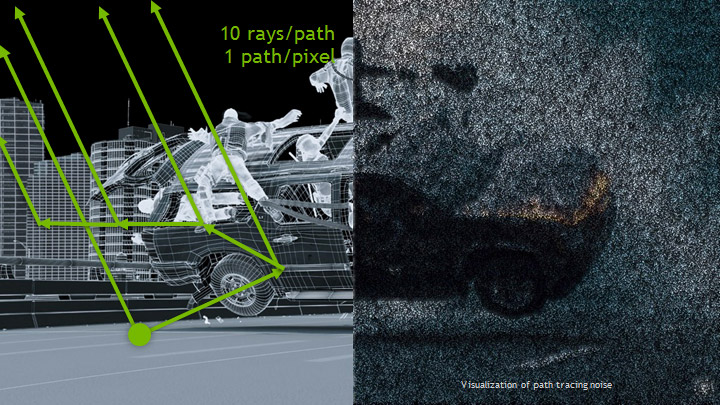 Film graphics solves this problem by tracing thousands of paths at each pixel. All of those paths at ten rays each are why path tracing is a net 10,000x more expensive than ray tracing alone.