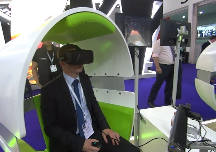 On the Airbus Defence and Space booth they showcased cutting-edge products, technologies and services using virtual reality in a first for a major defence show. Special swivel chair pods were equipped with Oculus VR DK2’s, a unique hand controller, and mounted audio system in order to transport them into three unique experiences crafted especially for the exhibition. The first comprised a virtual air show presenting a virtual line-up of the latest in Airbus’ fleet of aircraft ranging from the giant ‘A380’ super airliner to the mighty ‘A400M’ military cargo plane, and an appearance by the new ‘TANAN’ UAV (Unmanned Air Vehicle).