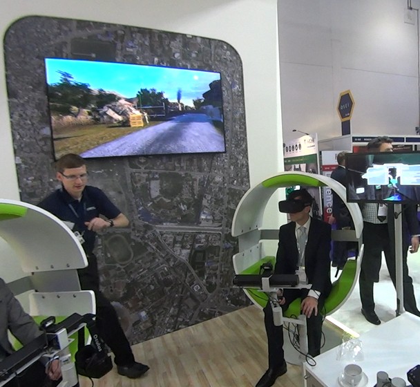 Virtual Reality was only visible (publicly) on one other booth at the defense show, with a demonstration of a Sensics HMD being deployed in a multi-role combat simulator allowing information from aerial assets to be combined in a combat mission. Sensics famously involved with Razor in development of a n open source, consumer HMD (the OSVR HDK) building on their considerable experience in the professional VR displays long before this current phase of interest. And proving the Vis-Sim sectors influence in driving tech, it was revealed during DSEI’15 that there would soon be a brand new HMD offering from an undisclosed manufacturer that would hope to break the 4K per-eye ceiling of clarity; though aimed at the pockets of the defence industries it will surely spark interest outside of the commercial sector.