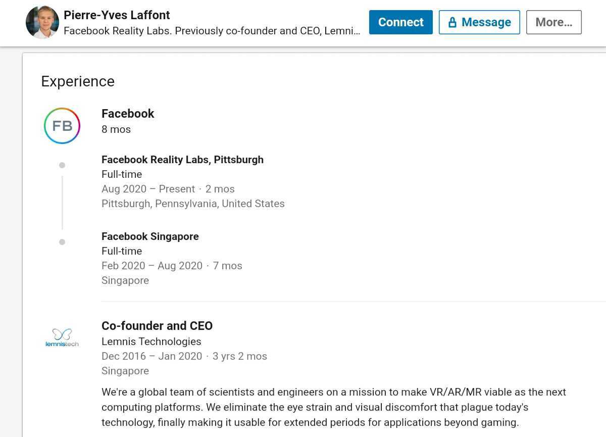 As reported by Chinese AR/VR publication Yivian, Laffont recently updated his LinkenIn profile to indicate that he’s been working full-time for Facebook since February 2020, with his most recent posting at Facebook Reality Labs in Pittsburgh, Pennsylvania.