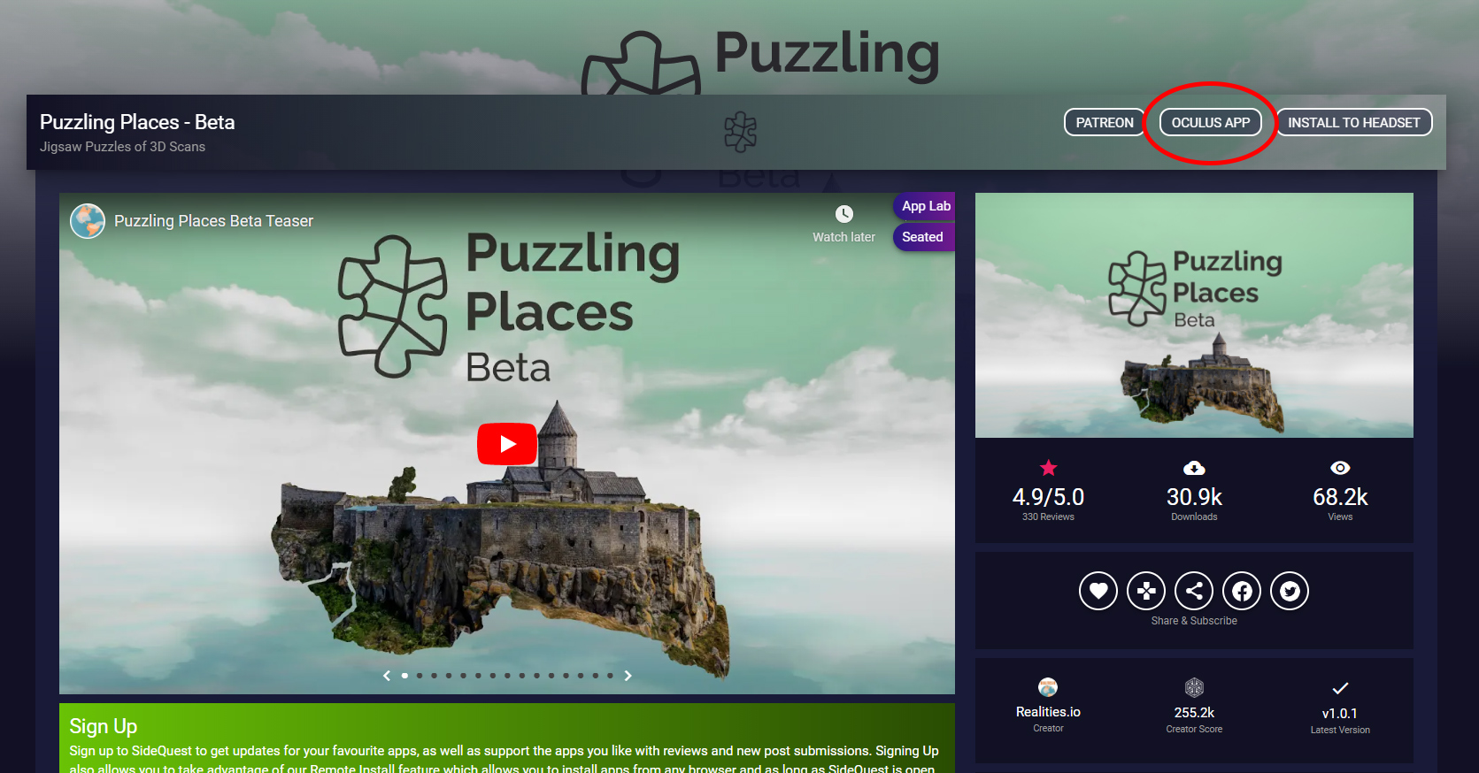 SideQuest is a longstanding alternative to the official Quest store. And while the platform is largely built around the ‘sideloading’ method as a back-door to skirt Oculus’ curation, the platform is also open to listing the easier-to-install App Lab apps as well. You can find all App Lab apps hosted on SideQuest in the App Lab section. To find the app’s App Lab page, click the ‘Oculus App’ link.