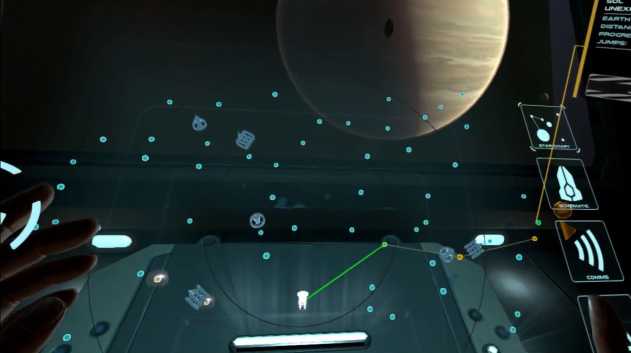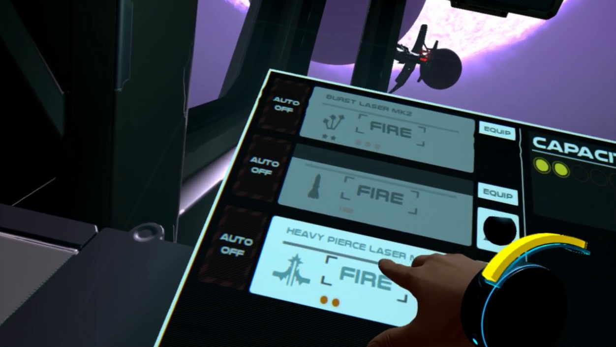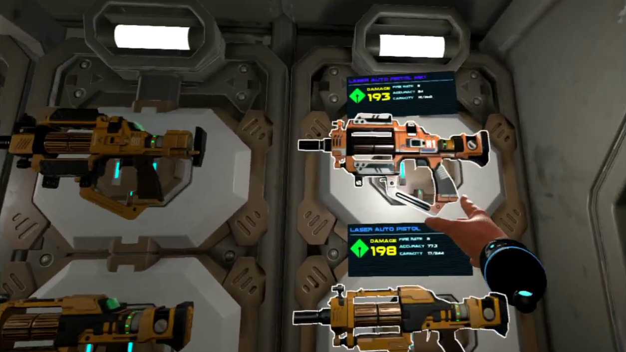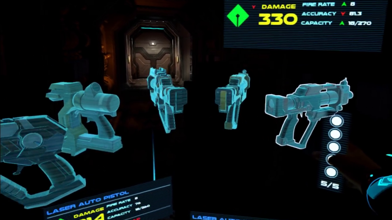 Because so much depends on your ship, the first-person shooter element offers a welcome pause to the otherwise technical resource management nature of the game. I wouldn’t call it a perfect VR shooting experience though, as the game’s slew of comically large blasters don’t provide any way of looking down sights, leaving you to spray and pray until you can get a feel for where and how the gun shoots. There are about 5 or 6 classes of guns that vary in strength and magazine capacity, so you’ll have to keep a look out for better guns as you stalk through enemy ships. In the end, I was hoping it wouldn’t be all about single-handed weapons and eventually offer some two-handed weapons too, but alas, you’ll find yourself wielding rocket rifle-sized “pistols” throughout.