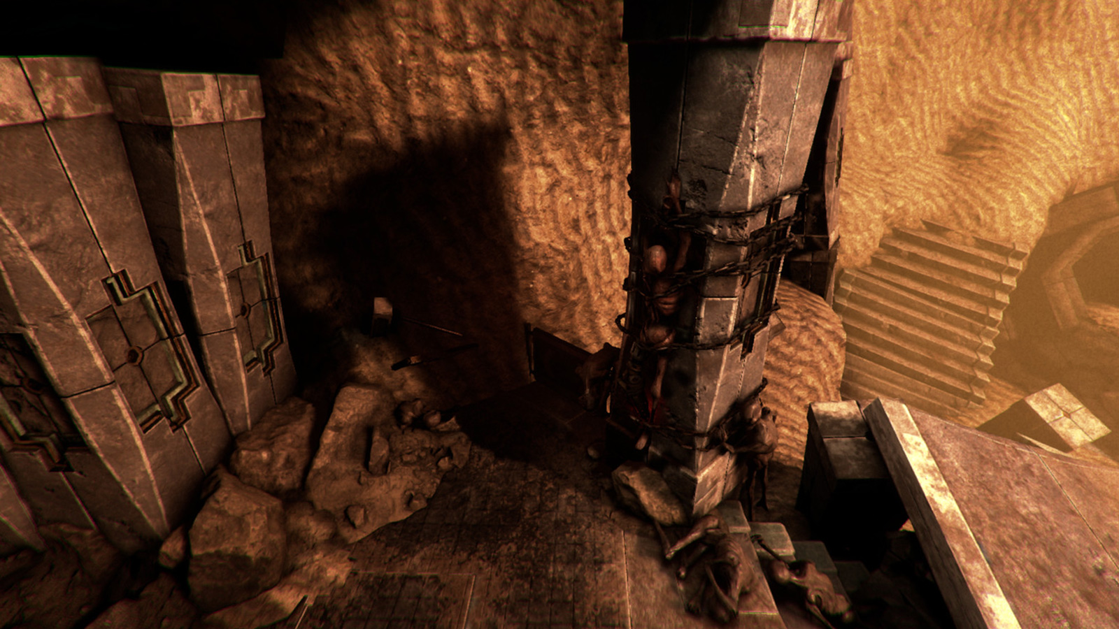 Most doors and certain quest items are accessed by guiding your gauntlet’s stone through a translucent tube with moving barriers, that when you fail to guide it correctly and touch the barrier or edges of the tube, it resets everything. These range from extremely simple—a straight tube with no barriers for commonly-accessed spaces like elevators—to increasingly difficult puzzles as you move along.