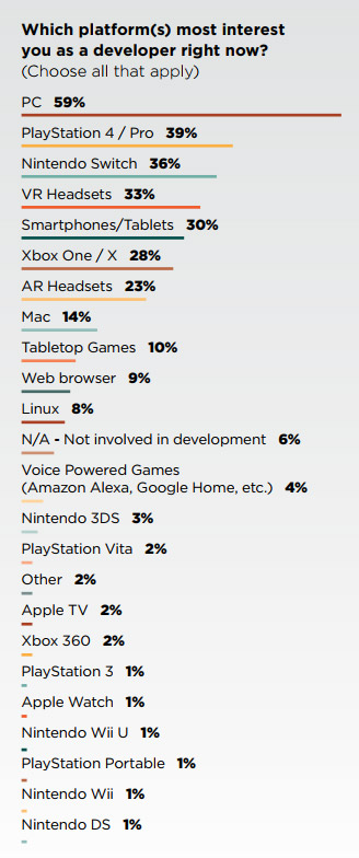 But when it comes to which platforms developers are ‘most interested’ in (which we take to mean from a creative and design standpoint, market suitability notwithstanding), a large share of developers picked VR as their top choice, beating out mobile platforms (smartphones and tablets), the Xbox One (and One X), and others. The only platforms with a greater share of ‘most interested developers’ are the Nintendo Switch (36%), PlayStation 4 (and PS4 Pro) (39%), and PC (59%).
