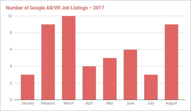 Google is continuing to grow its AR and VR teams and shows no signs of stopping any time soon. Road to VR has assembled data showing that so far in 2017 the company has listed an average of six new job postings per month—either explicitly for the AR/VR team, or in tangential roles—totalling 49 new listings in the first eight months of the year.