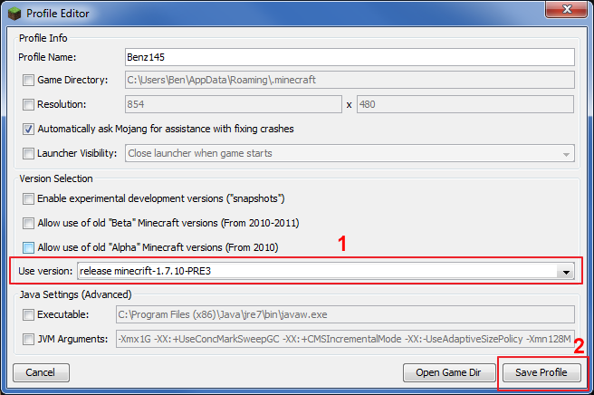 - Change ‘Use version’ to ‘release minecrift-1.7.10-PRE3’ then select ‘Save Profile’.