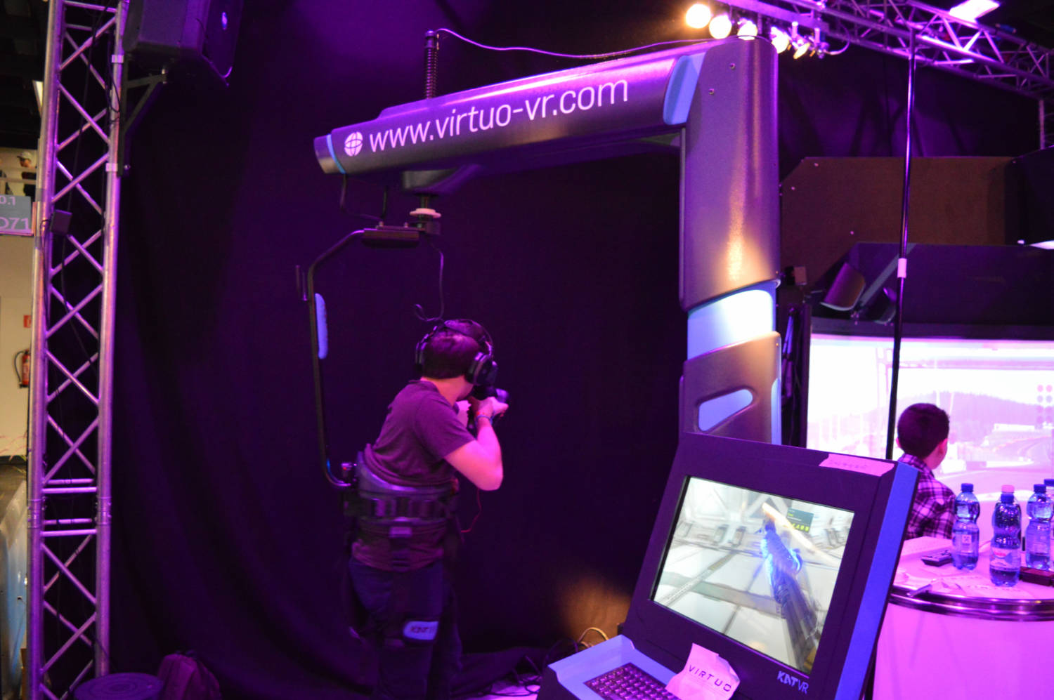 I was greeted by Virtuo VR founder and owner Ali Cakan, an ex-military member turned tech distributor looking for the next big thing. Cakan opened two of the heavy-duty treadmills to the Gamescom-going public, along with a few motion platforms playing racing games tossed in for good measure. Clearly, the impressive-looking Kat Walk treadmills were the crowd favorite, as a long line snaked around the booth populated with German teenagers sitting on boxes and fold-out chairs awaiting their turn for what promised to be a unique experience.