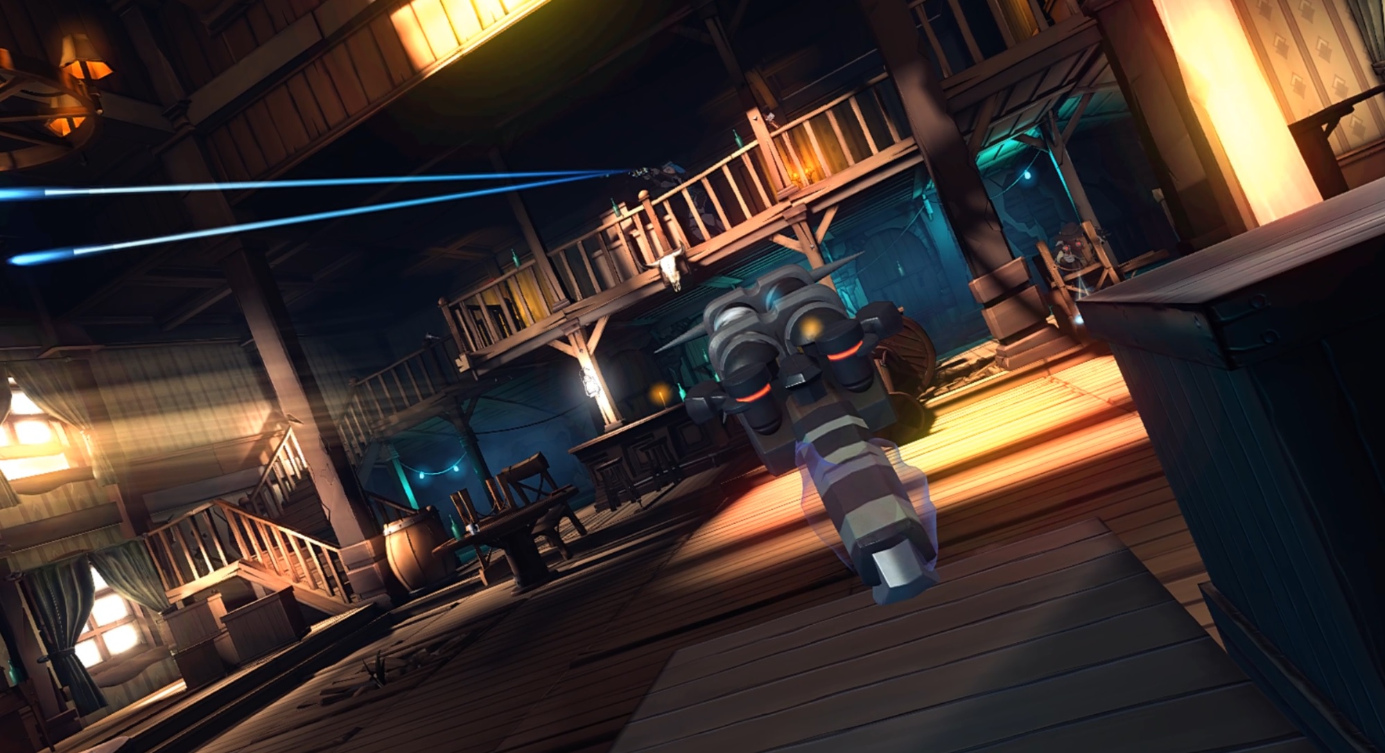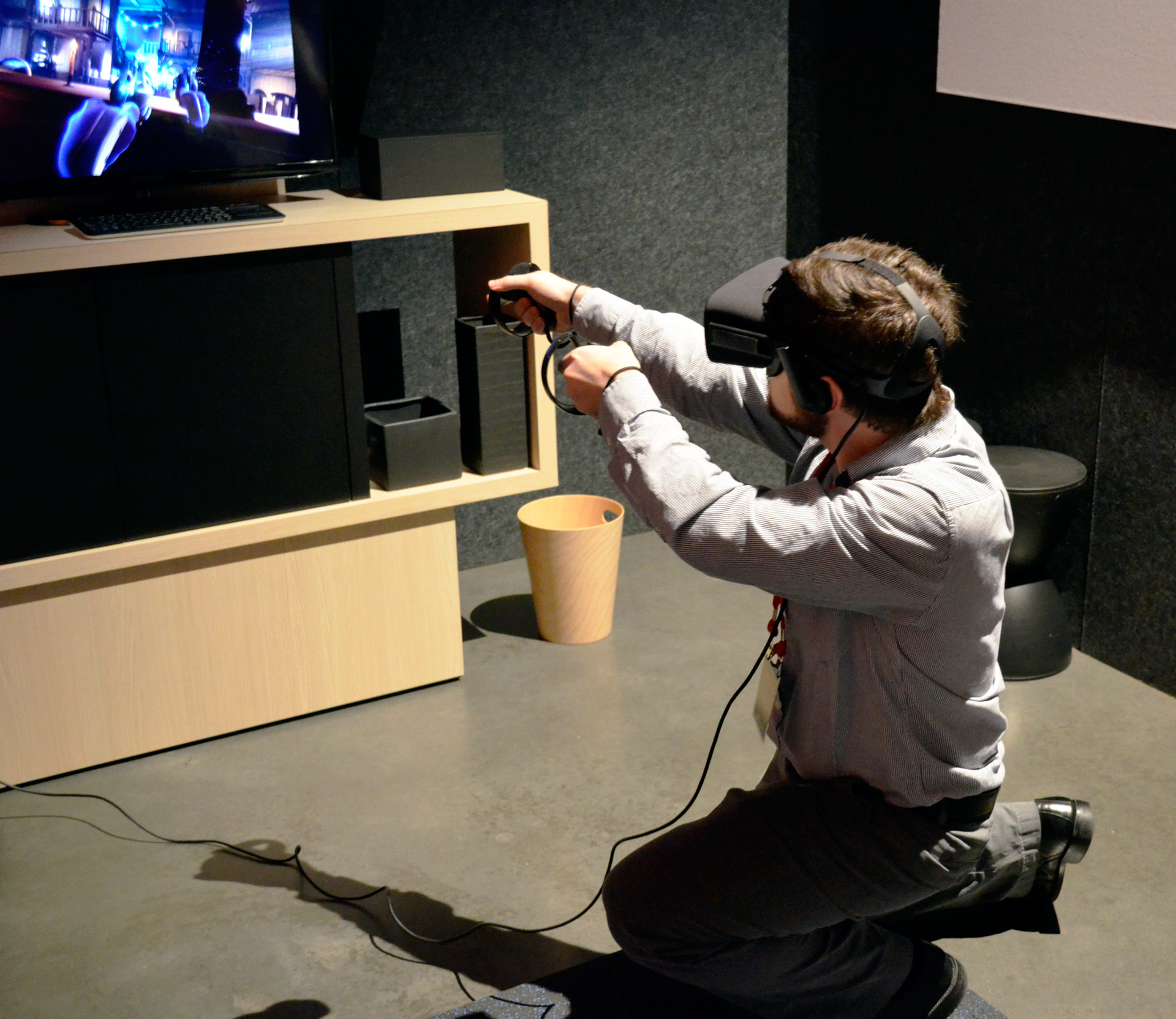 At one point I was spawned behind the bar on the right side and was quickly pinned down by the enemy. I could see a shotgun on a shelf in the middle of the bar about five feet away. This was actually intended to be obtainable from a closer spawn point, but I physically crawled over to it (off of the little mat Oculus placed on the floor to give me a sense of my playspace), grabbed it, and crawled back. With that, I had all the firepower I needed to turn the tide and scare my opponent into cover.