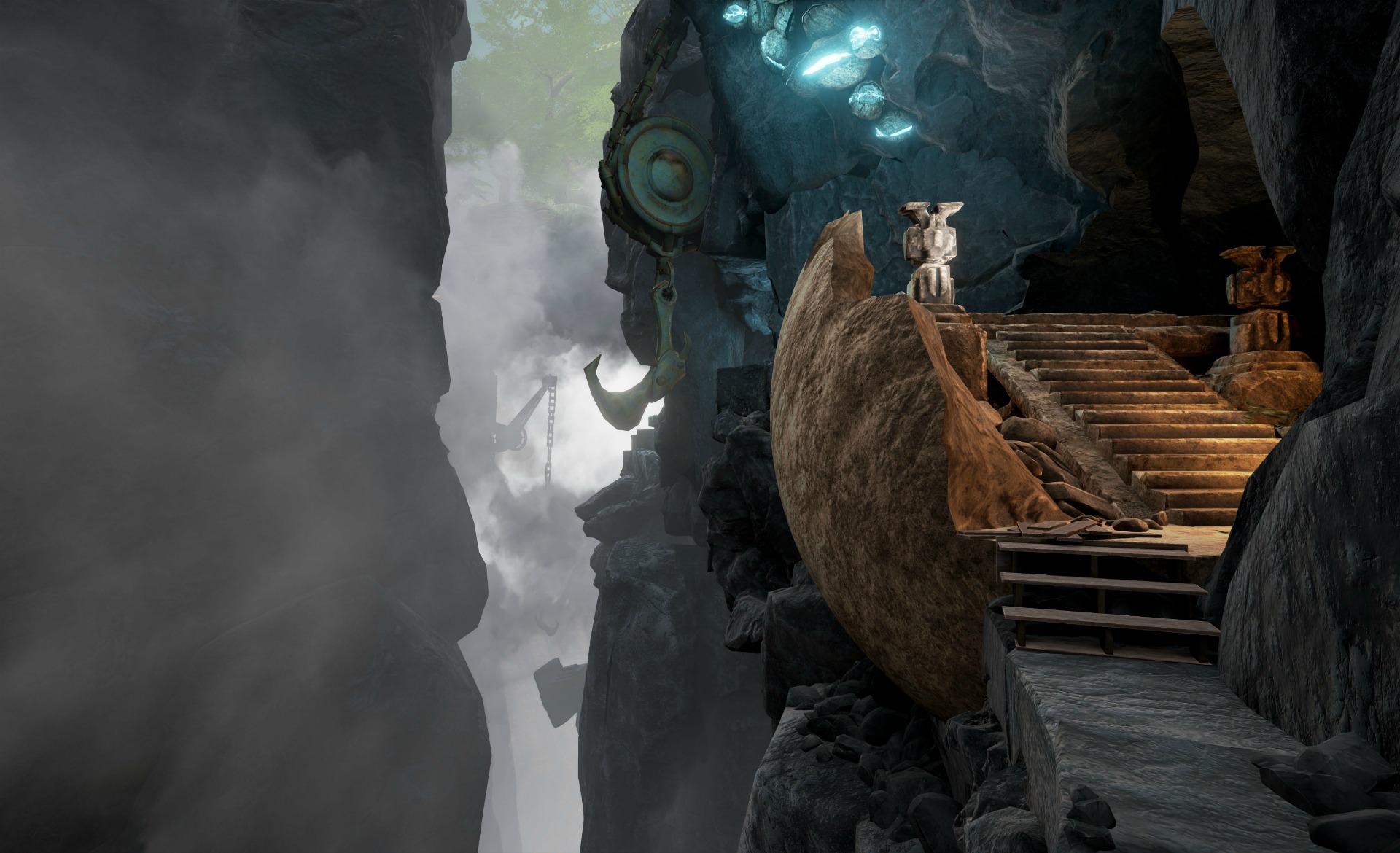 Traversing down the cliff side, I run into pieces of some ancient behemoth machine littering the way. The further I descend, the more ruins I find until I happen upon a giant room containing a bottomless pit and a 500 foot crankshaft standing lengthwise above me. More levers, more valve wheels, a button pad containing numbers and Cyrillic script. Turning the right levers and wheels I extend a sort of propeller. Catching wind emanating from the endless drop below me, the massive crankshaft slowly comes to life. I’ve awoken a machine of some sort – and that’s when the demo ends.