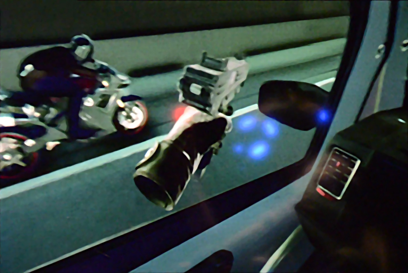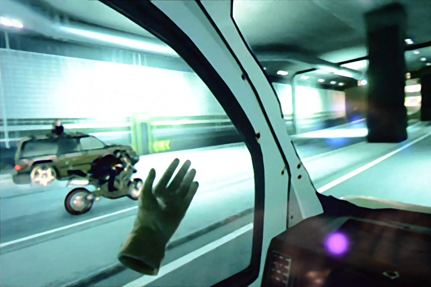 It isn’t long before an enemy on a motorcycle comes speeding up on your van, letting loose a salvo of machine pistol fire. Your accomplice, not terribly happy about this, rams the rider’s bike from behind, causing him to land on the windshield before falling down and getting run over by the van. At this point your driver punches out the damaged windshield.