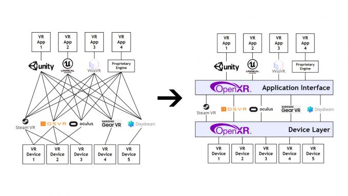 Similarly, if a new game engine wanted to offer support for VR, it needs only to target the OpenXR Application Interface to potentially work with every headset and VR platform that supports OpenXR.