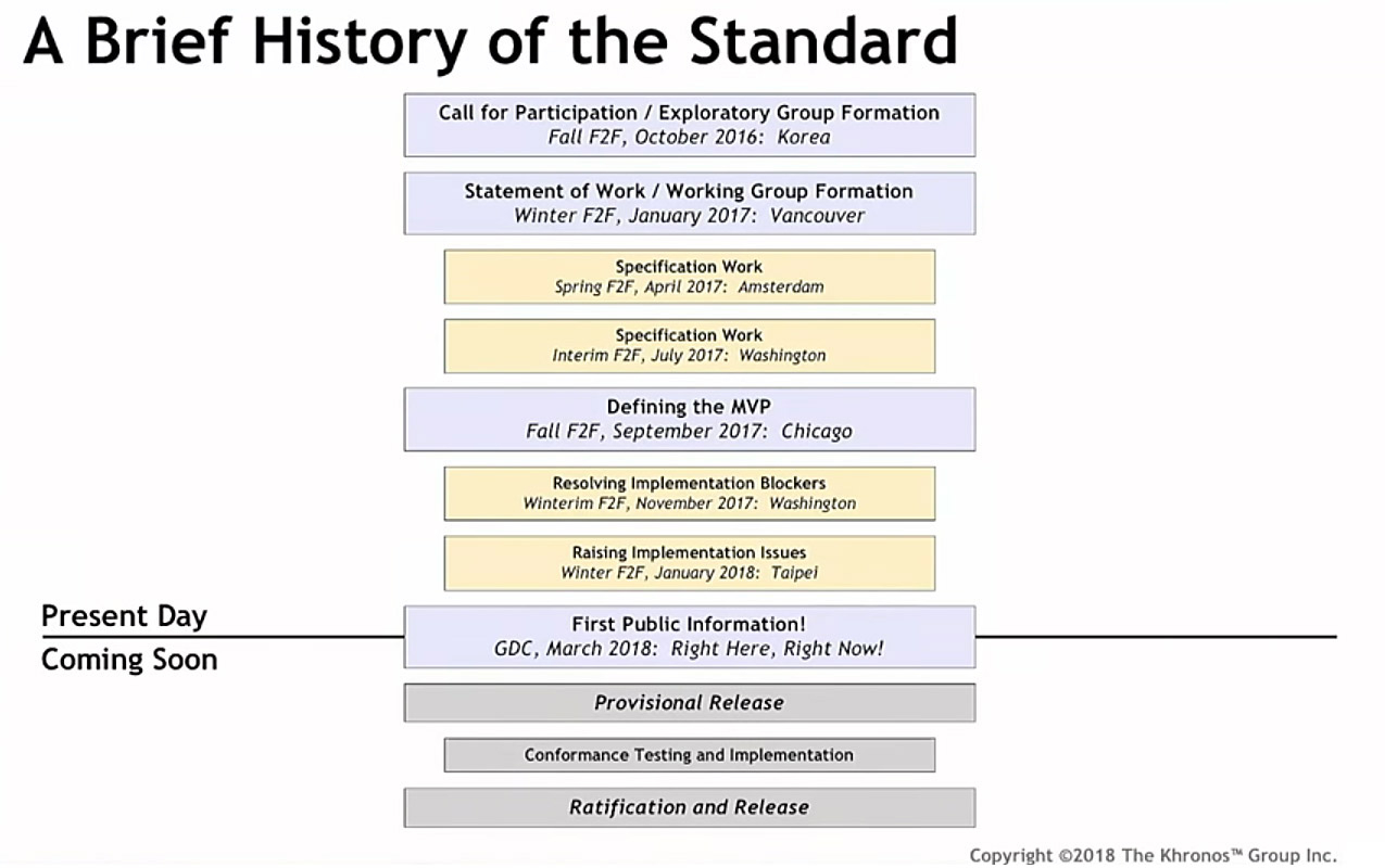OpenXR is an in-development standard that’s open and royalty free. It’s being developed by a consortium consisting of effectively every major player in the VR market, including chip makers, headset makers, game engines, publishers, and VR app stores. The standard is being developed under the Khronos Group, the organization behind a number of major graphics standards like OpenGL, WebGL, and Vulkan.