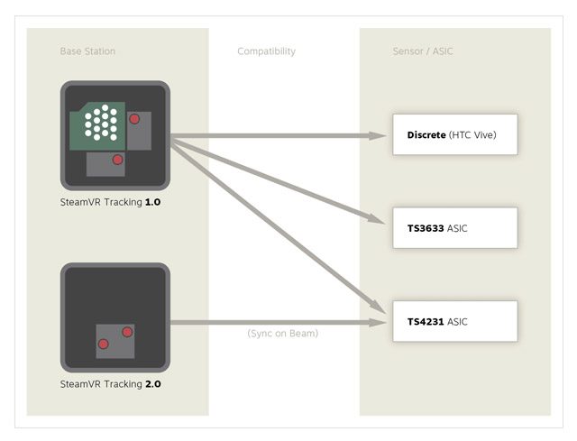 The latter would ensure forward-compatibility with SteamVR Tracking 2.0 base stations when they arrive but ensure that all base stations out in the ecosystem work with all current Vive’s (since the SteamVR Tracking 2.0 base station only supports the 2.0 sensors, but the 2.0 sensors support 1.0 base stations). That would avoid fragmenting the tracking systems until a Vive 2 hits.
