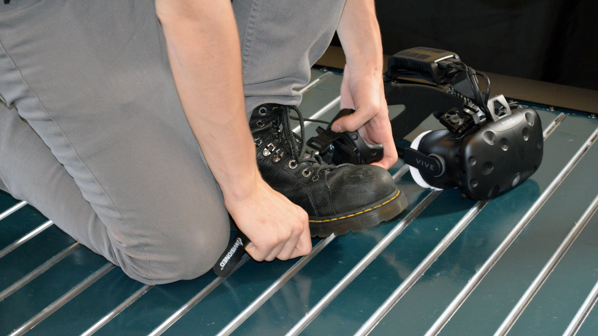 With the latest Infinadeck prototype, which I saw recently at SVVR’s Silicon Valley HQ, the company has moved from physical motion detection to using a Vive Tracker mounted on the waist to precisely sense the location of the user with very low latency. Along with Vive Trackers placed on the feet (not currently used for calculating the VR treadmills movements, but used to show the user where their feet are), the feeling of walking has been significantly improved, even when wearing a VR headset.