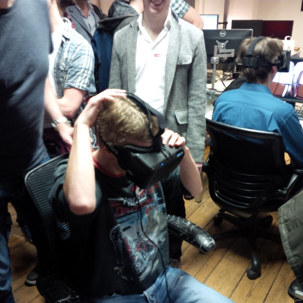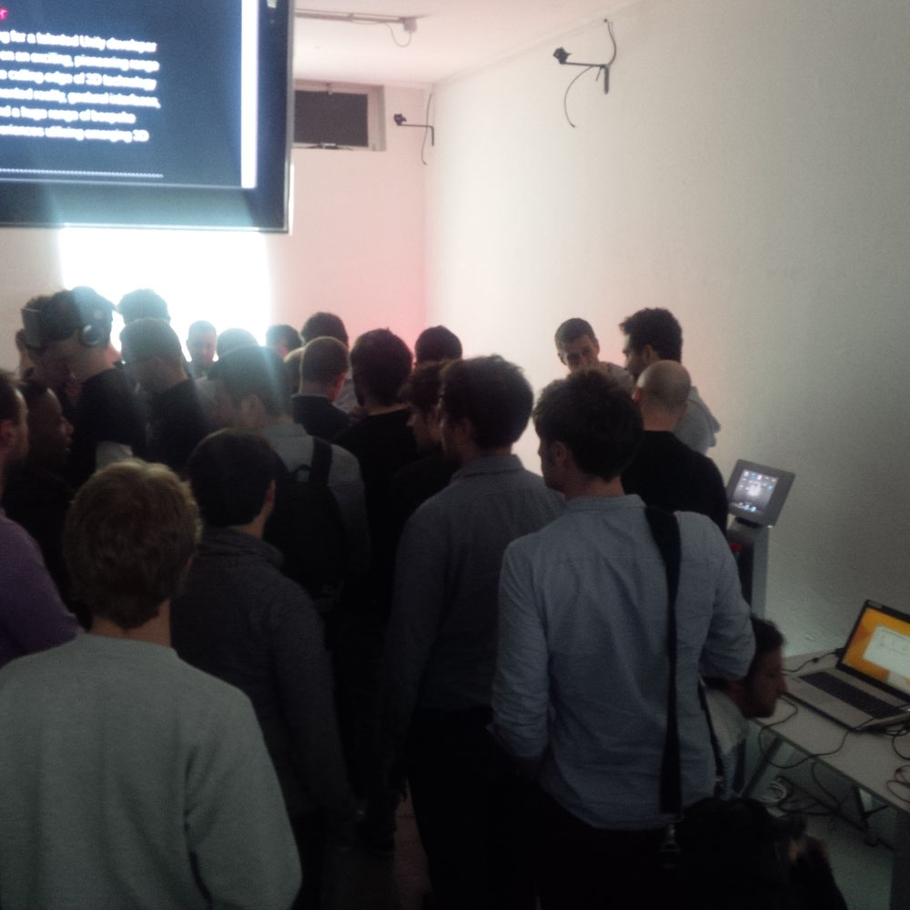 The recent meetup saw the first appearance in the UK publically of an Oculus Rift DK2— the equally newly minted Oculus VR ‘Developer Relations Manager’ (Callum Underwood) — his first outing walking the VR community gathered at the Bossa Studios through the DK2.