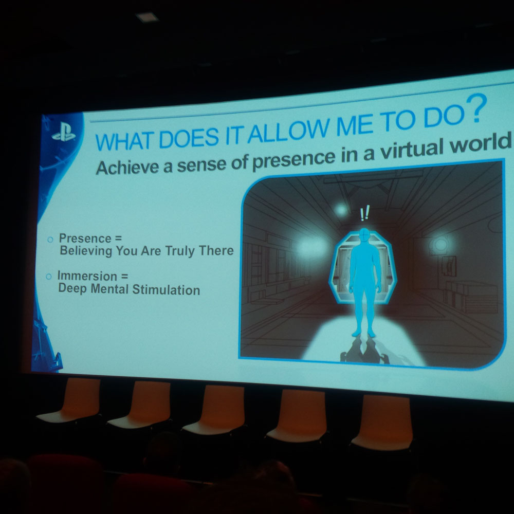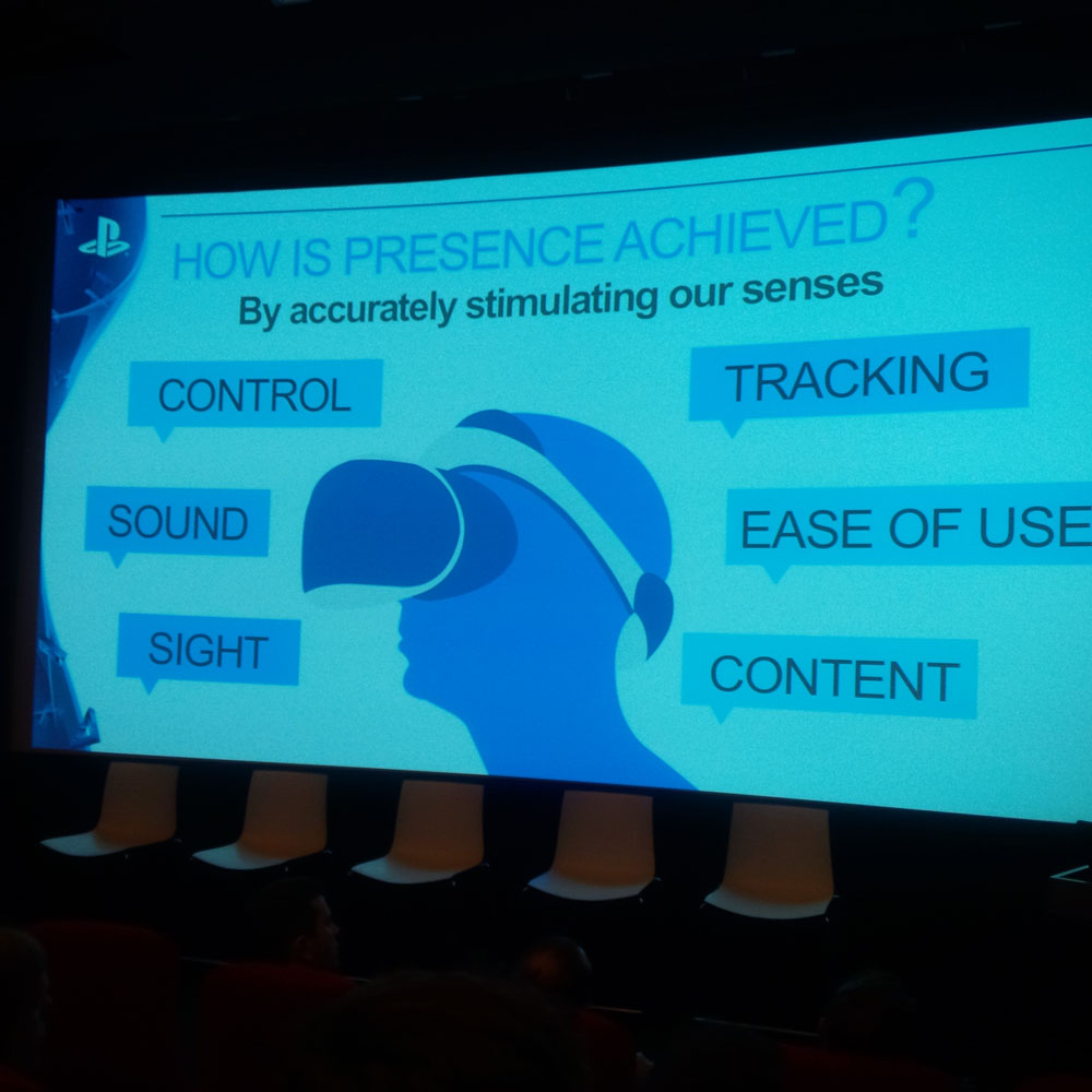 The fundamentals of ‘Control’, ‘Tracking’, ‘Sound’, ‘Ease of Use’, ‘Sight’ and ‘Content’ will be driving the development in this space. The need for ‘presence’, a watchword borrowed from Valve by the Sony team, and the avoidance of breaking this perception were discussed.
