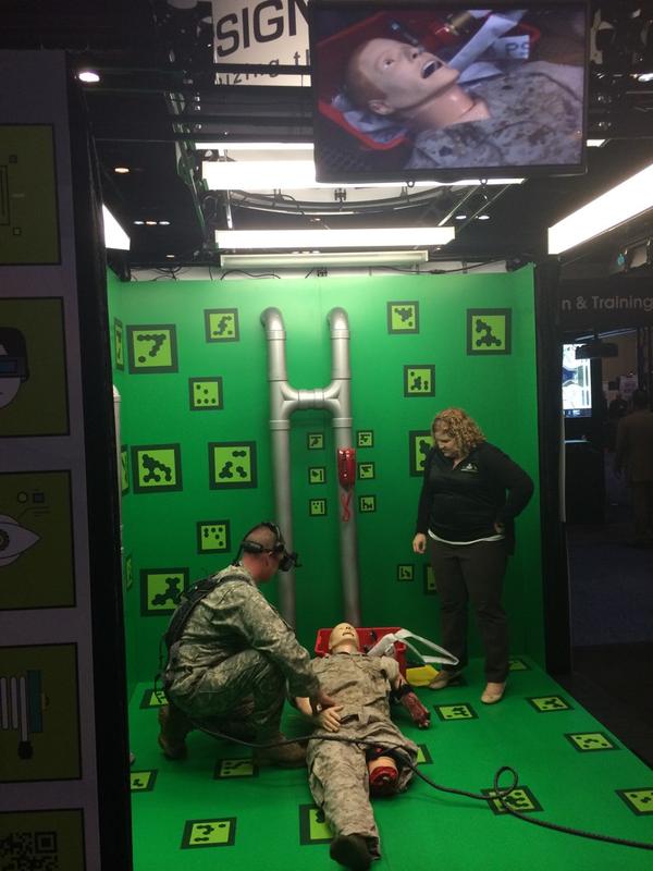 They brought a whole suite of VR and AR systems to the I/ITSEC conference that, when combined, make a mixed-reality solution which uses fiducial markers stuck onto the walls of a green screen booth nearby.