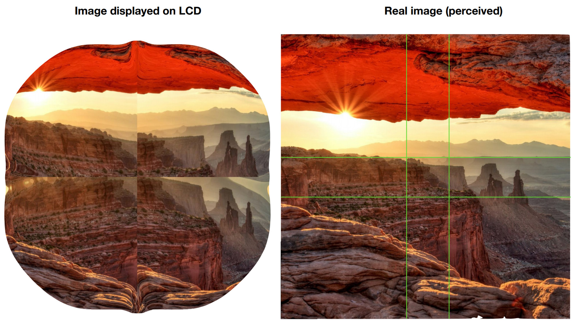 Larroque says the novel design allows the eye to come closer to the lens (to make the headset more compact overall) and for a hidden eye-tracking camera to be placed directly in the center of the lens for accurate eye-tracking. He showed a sample of the image distortion pattern which is used to counteract the distortion introduced by the lens.