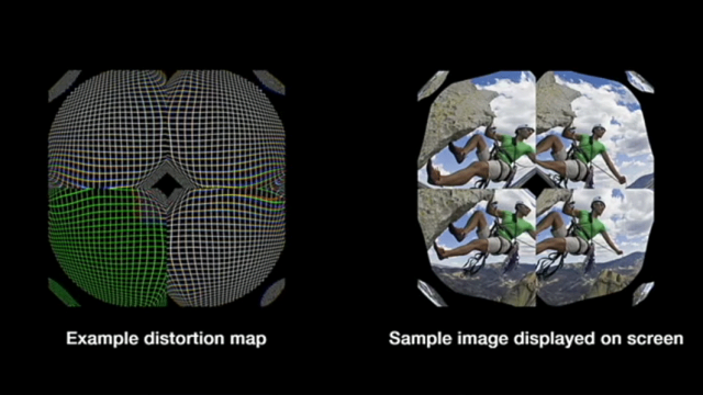 The “light folding” optics are designed to wrap the image from the display around the eye-tracking camera to make it invisible. Larroque said that the image on the display is divided into four quarters and then reassembled into a single image by the optics. He showed the headset’s ‘distortion map’ which defines how the initial image is pre-warped to counteract distortions in shape and color introduced by the lens. While pretty much all headsets use pre-warping, the R-1’s distortion map is pretty complex by comparison.