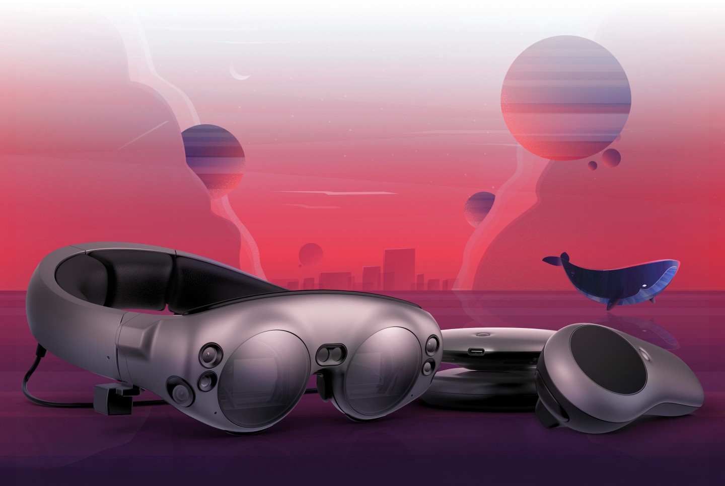 The Magic Leap One consists of three elements: a light-pack, a headset and a controller — all of these components are beautifully designed, with colorful lights coming from unexpected places.