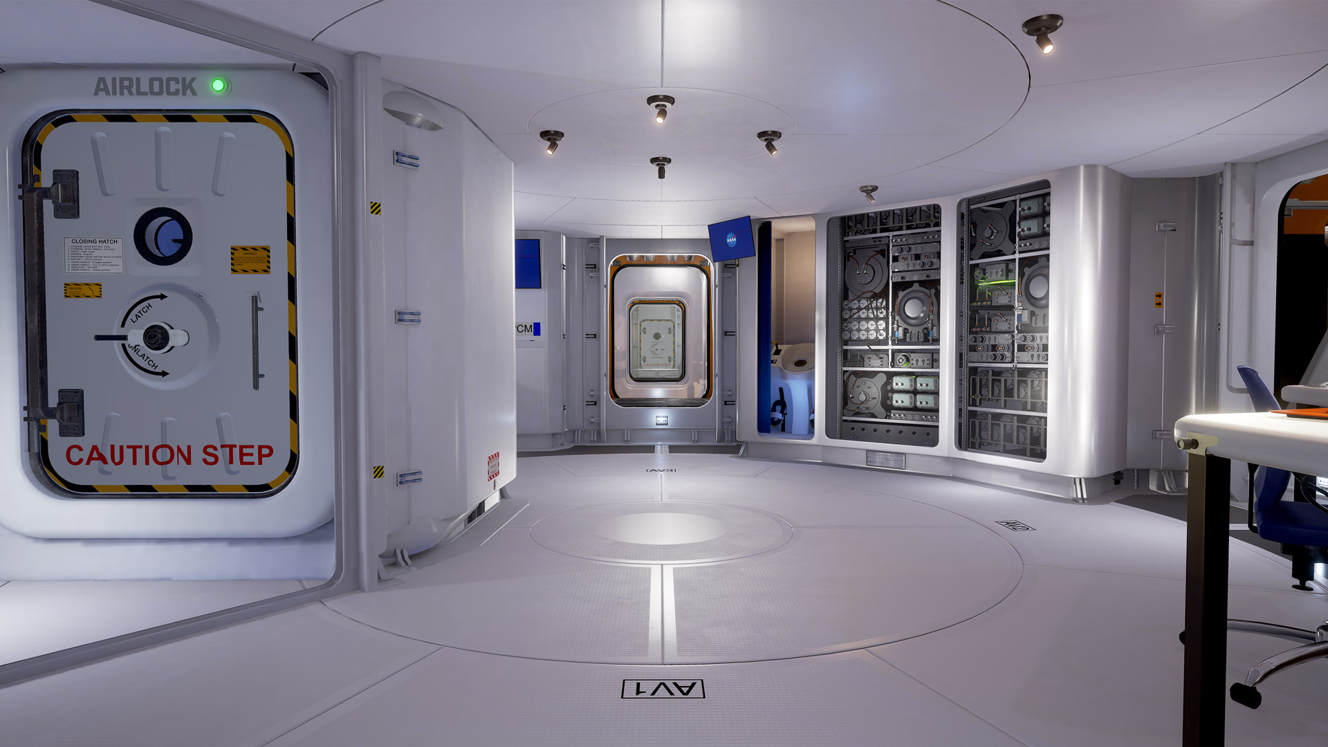 The inverse kinematics on the avatar’s arms look odd, probably because the hands (and their resting position) don’t seem to line up agreeably with where my hands fit on the Vive controllers. My character is seated, so I feel compelled to sit too. Resting the controllers on my knees, the virtual hands clip through my virtual legs. It’s possible to reset the camera and sit in such a way that this doesn’t happen, but it would certainly benefit from some fine tuning here. (After being spoiled by the incredible hand animation in Lone Echo, this kind of thing stands out.) While this could be explained as the result of maintaining 1:1 tracking of the hands, the hands also clip through the legs if you play it with a gamepad, where you have no direct control of your arms—something that doesn’t occur in the rover, so I suspect it can be fixed.