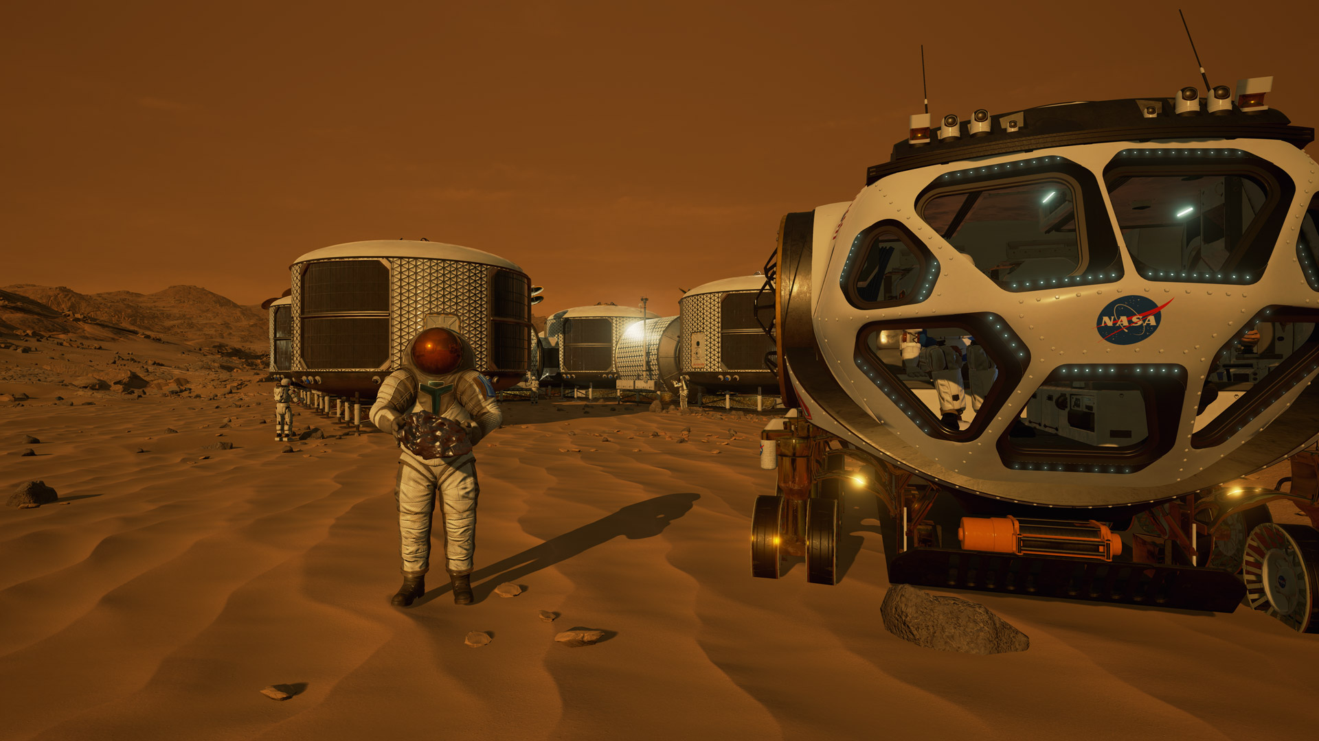 Original Article (7/27/17): Unquestionably, Mars 2030’s greatest assets are… its assets. The vast landscape is covered in detailed geometry and textures, and the habitat, vehicles, and other equipment are modelled to a high quality. Combined with convincing lighting and shaders, the result is, at times, very impressive.