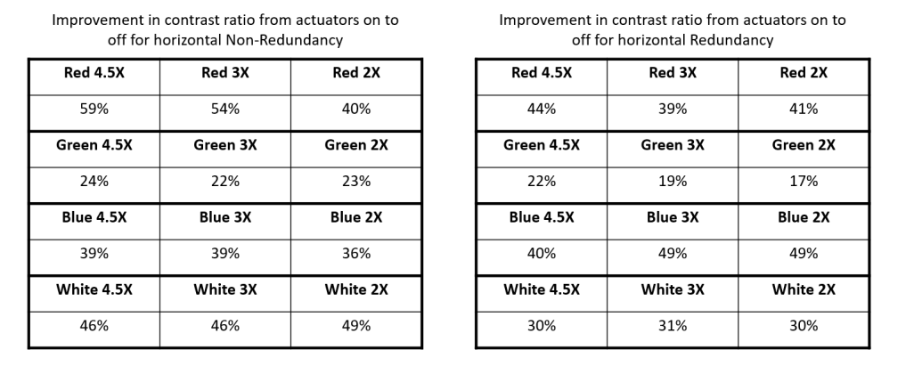 Another approach to quantify SDE reduction was to measure the contrast ratio of a section of the display and compare it to when the screen actuation was on vs. off. Lower contrast would imply less SDE due to moving pixels filling in the unlit spaces and creating a more solid image. While the authors maintained that this measurement isn’t necessarily a reflection of the SDE reduction as the naked eye would see it, they believe it’s a meaningful quantitative measurement.
